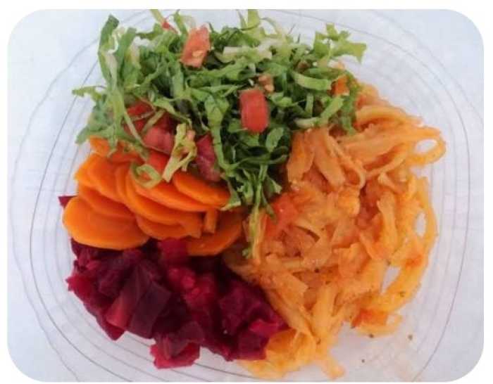 Espinafre, acelga, tomate, abóbora, inhame, batata-doce, quiabo, beterraba, couve-flor, cenoura, chuchu, arroz, macarrão de arroz sem ovos, água de coco.