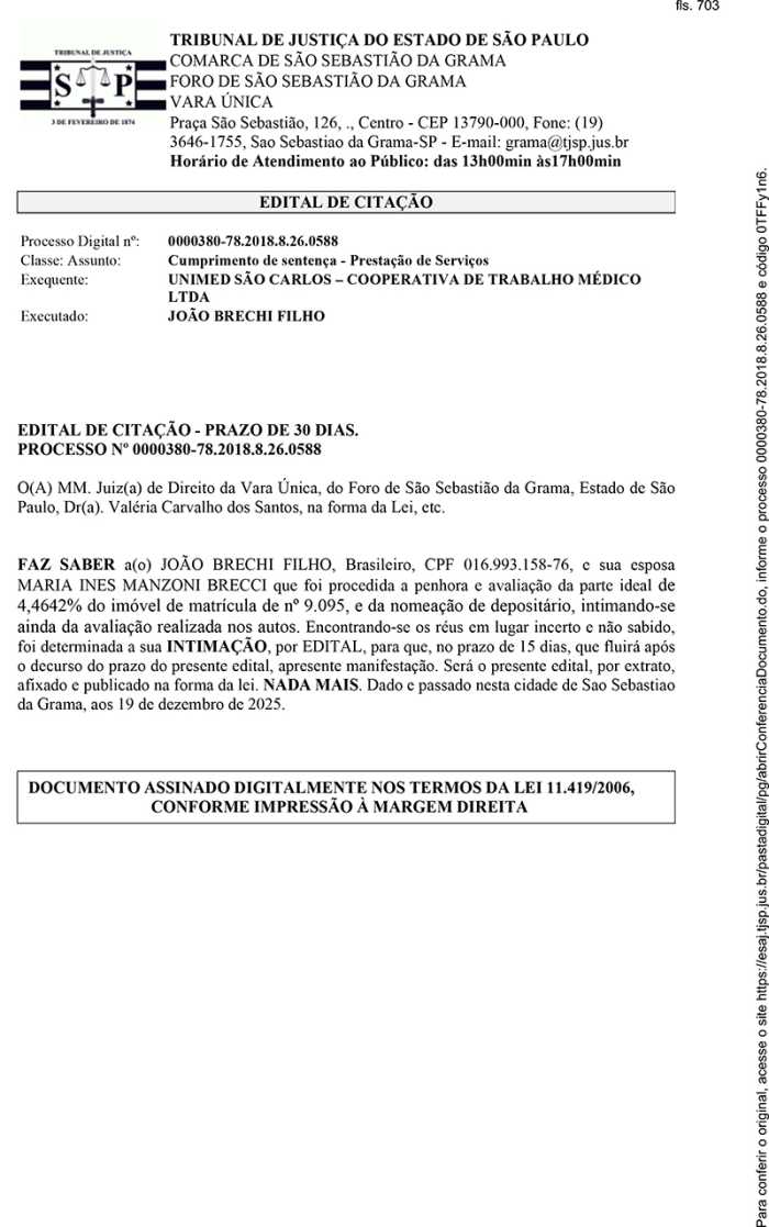 EditaisEDITAL DE CITAÇÃO PROCESSO 000380-78.2018.8.26.0588 Por Marcio Chaves 02/02/2026 - 20h50 00Jornal Democrata, edição 1908 de 31 de janeiro de 2026 Publicidade Ouça o áudio da Matéria Edital de Citação Processo nº 0000380-78.2018.8.26.0588 Cumprimento de sentença Prestação de serviços Vara Única de São Sebastião da Grama Penhora de imóvel UNIMED São Carlos João Brechi Filho Intimação por edital Poder Judiciário COMENTÁRIOSEfetue o Login ou Cadastre-se para participar.