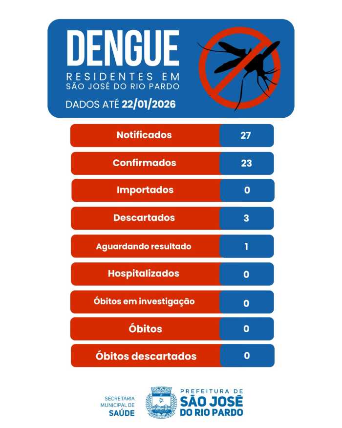 De acordo com boletim atualizado até 22 de janeiro de 2026, São José do Rio Pardo registra 27 casos notificados, sendo 23 autóctones, 3 descartados e 1 em investigação. Não há registros de casos importados, hospitalizações ou óbitos.