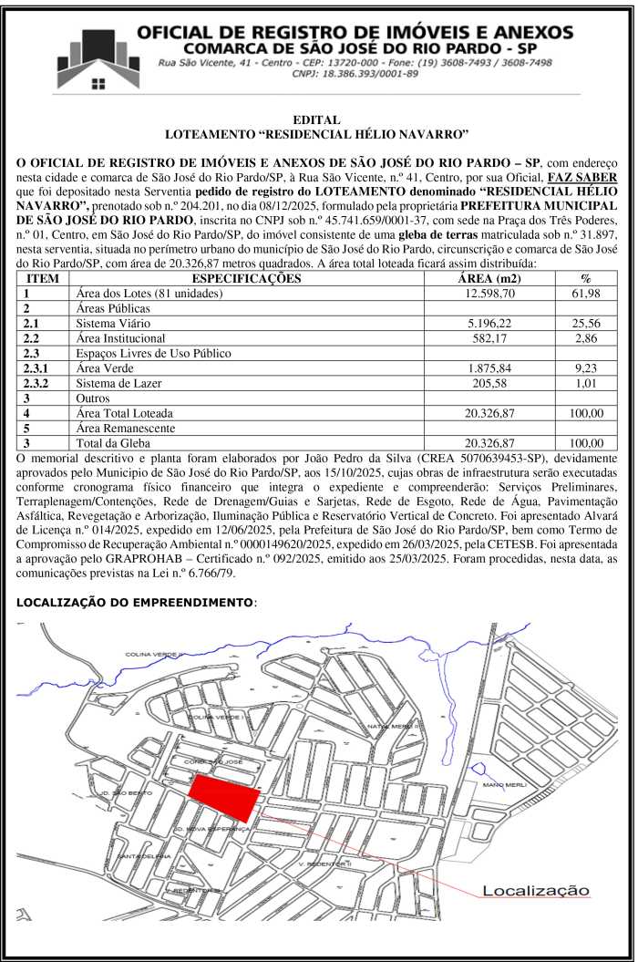 EditaisEDITAL Loteamento Residencial Hélio Navarro Por Marcio Chaves 09/02/2026 - 13h16 00 Edital Publicidade São José do Rio Pardo. Edital. Loteamento residencial Hélio Navarro COMENTÁRIOSEfetue o Login ou Cadastre-se para participar.