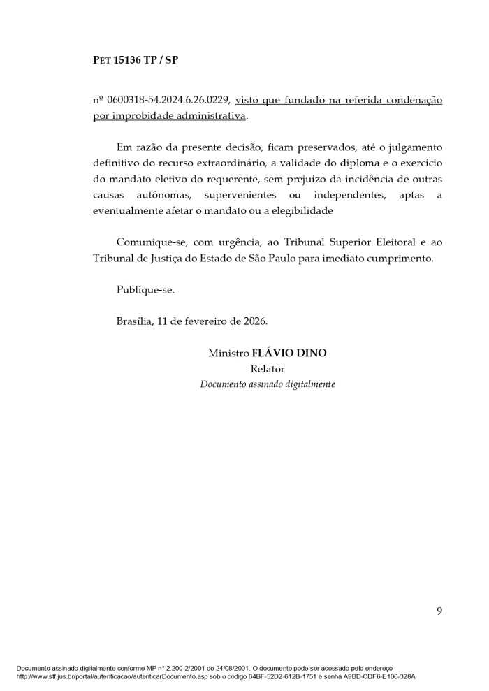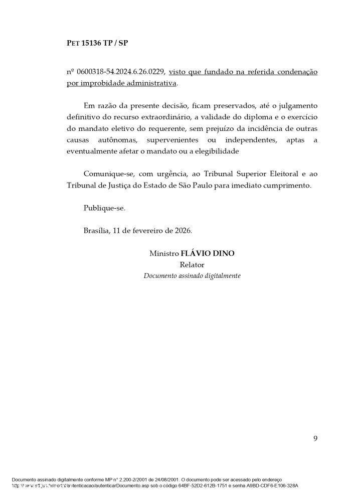 1. Decisão provisória: a tutela concedida por Flávio Dino é medida cautelar, em caráter antecedente — protege, temporariamente, o exercício do mandato até decisão final do STF. Se o STF rejeitar o recurso extraordinário, a suspensão cairá e restabelecer-se-ão os efeitos do TJ-SP e do TSE (cassação de registro/e perda de mandato, conforme o caso).