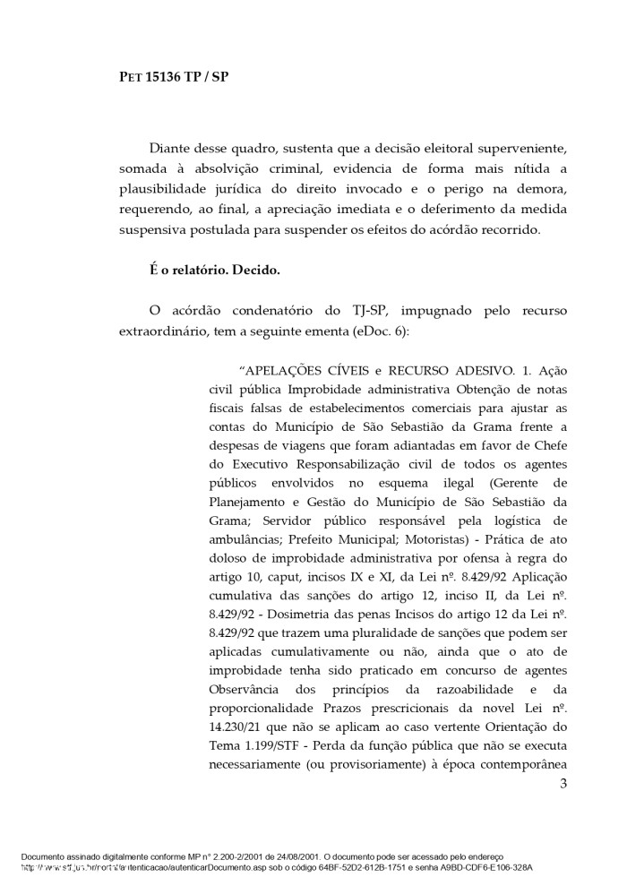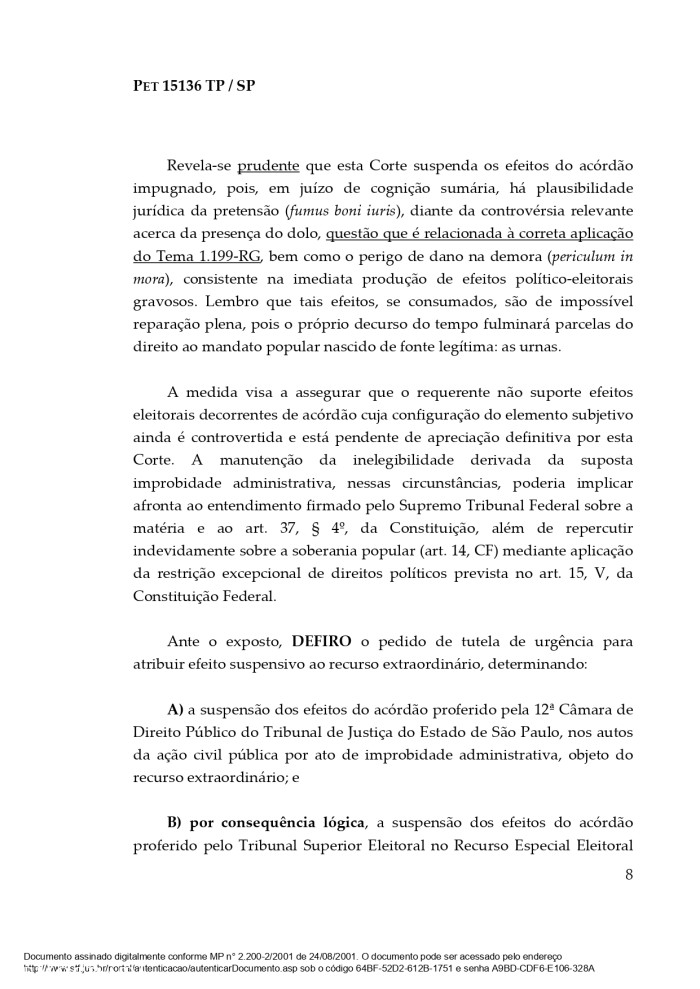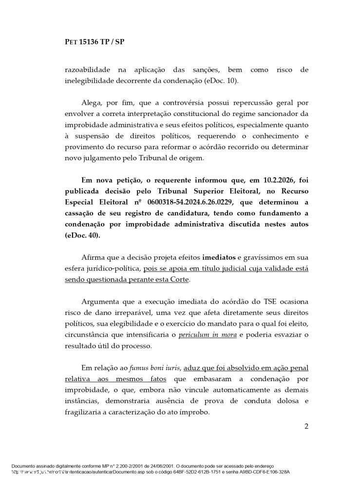2. Risco de efeitos irreversíveis sobre mandato nascido das urnas: o ministro ressaltou que a execução imediata do acórdão do TSE poderia causar prejuízo de difícil reparação ao exercício do mandato popular, caso o STF venha a afastar, ao final, a condenação ou a sua eficácia. Por isso, atribuiu efeito suspensivo ao recurso extraordinário, determinando a suspensão dos efeitos do acórdão do TJ-SP e, por consequência, do acórdão do TSE.