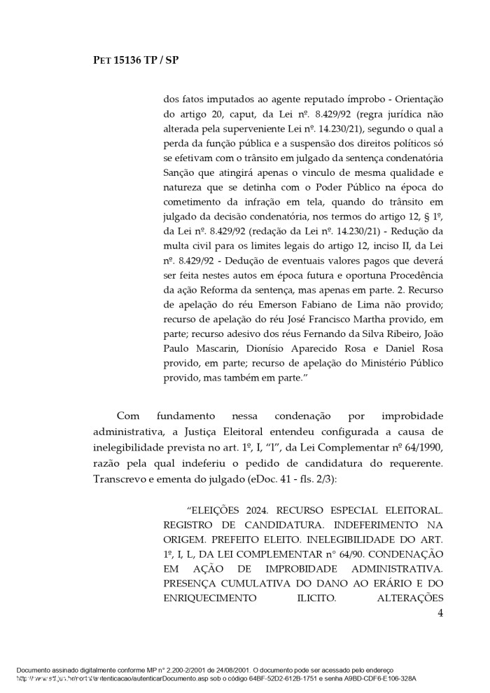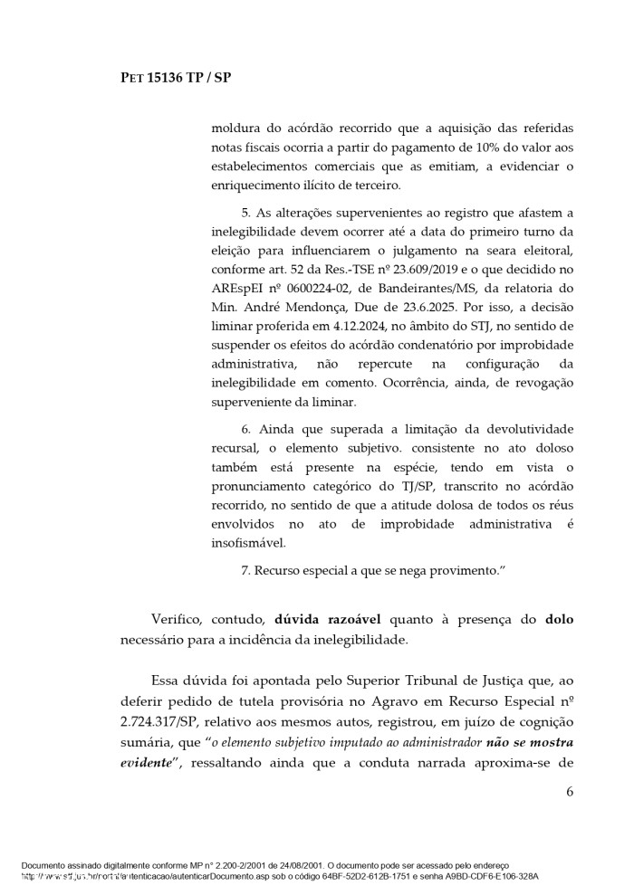 2. Força do acórdão colegiado do TSE: o acórdão do TSE foi formado por maioria e contém análise detalhada da documentação e do acórdão condenatório da Justiça Comum, no qual o TJ-SP encontrou dolo e elementos de enriquecimento ilícito (inclusive menção a pagamento de ~10% para emissão de notas). Essa fundamentação tem peso em eventual revalidação da inelegibilidade.