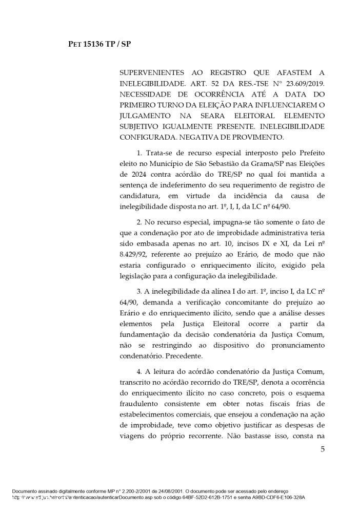 3. Marco temporal e precedentes do TSE: o TSE tem jurisprudência consolidada (e regulatória para 2024) no sentido de que alterações supervenientes ao registro só são consideradas até a data do primeiro turno da eleição — entendimento que, se mantido, limita efeitos de liminares posteriores que suspendam condenações e afastem inelegibilidades. O acórdão explicitou esse marco temporal e utilizou-o para negar eficácia retroativa à liminar do STJ que fora concedida em 4.12.2024.