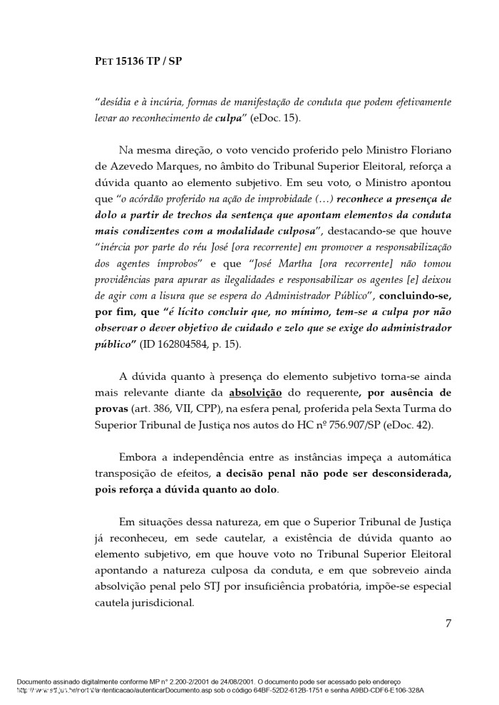1. Dúvida sobre o elemento subjetivo (dolo): o STJ, em decisão cautelar anterior, havia considerado que o dolo não se mostrava evidente na fundamentação — aproximando a conduta mais de culpa (desídia/incúria) do que de dolo específico. Além disso, houve absolvição penal no STJ por insuficiência de provas, que, ainda que não vinculante, reforça a controvérsia sobre a existência de dolo. Essas circunstâncias, segundo o relator no STF, tornam plausível a tese de que a aplicação da Lei de Improbidade (após as alterações e o Tema 1.199) exige comprovação mais clara do dolo.