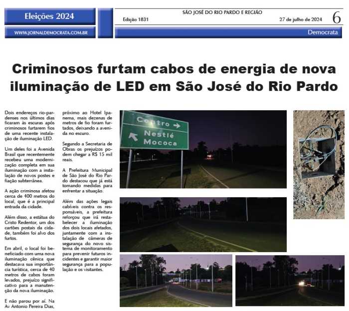 Julho de 2024: furto de cabos de nova iluminação de LED. CLIQUE AQUI e releia a matéria.