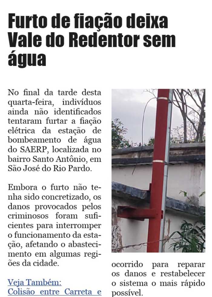 Outubro de 2025: furto que deixou bairro sem abastecimento de água. CLIQUE AQUI e reveja a matéria.