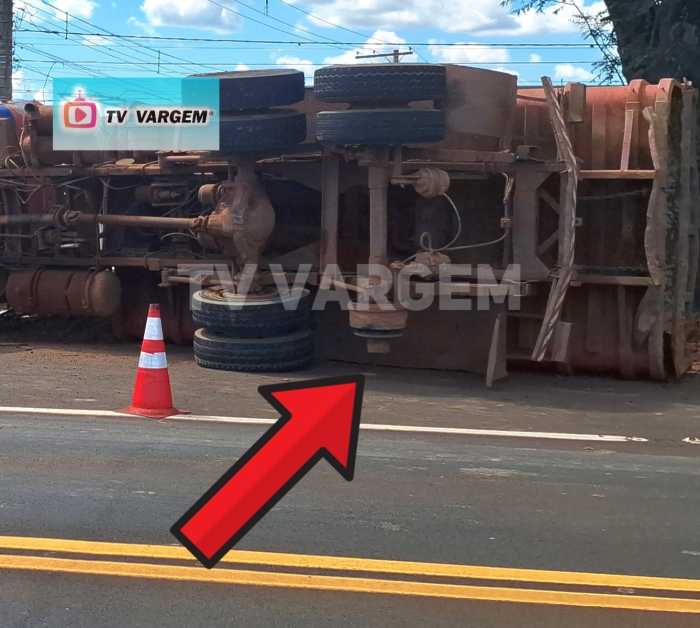 Caminhão tomba após perder roda na SP-215 em Vargem Grande do Sul