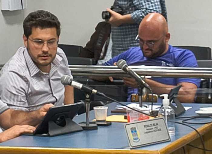 O político, de camisa azul, ao lado do companheiro de chapa nas últimas eleições, Alexandre Tozini. Tozini, com a soma dos votos da chapa (de Burger, inclusive), conseguiu eleger-se.