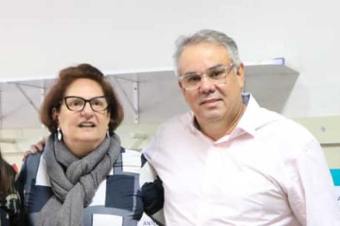 Diretora Maria Isabel Geraldo Calió e prefeito Eduardo Barison em imagem registrada na EMEB, divulgada em redes sociais da prefeitura